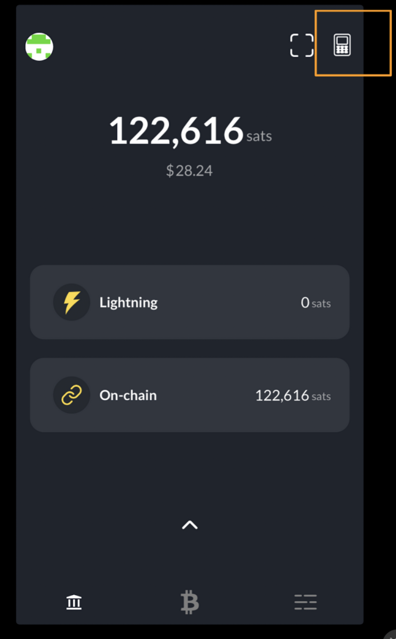 Step 8: Display QR code. Show patron the QR code. If there are issues, it is likely on there end, so some patience might be required while they iterate. If issues persist, scroll to the bottom of the screen, and ask the patron whether they want to pay with “Lightning” or “On-chain.” Depending on their answer, select one of the options at the very bottom of the screen and a new QR code will appear.