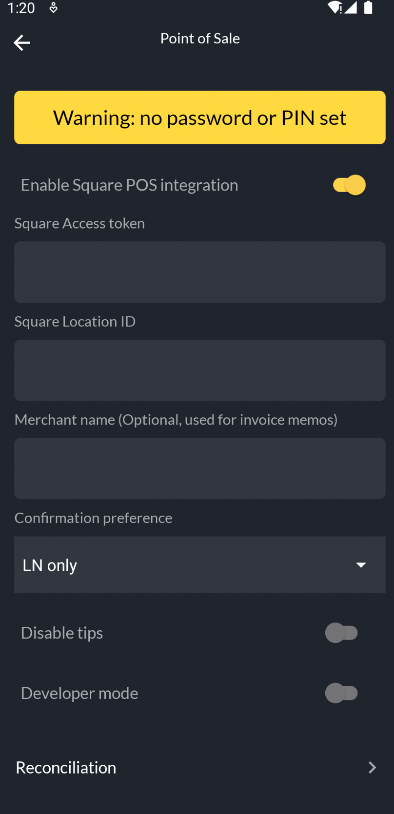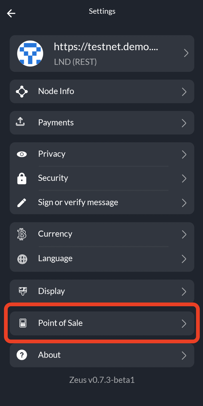 Note to proceed to POS settings, you must have a fiat currency set. This currency must match the currency used on your Square Terminal or you will have reconciliation problems.